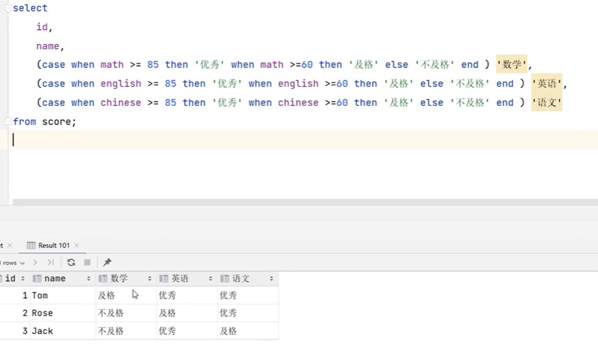 案例:统计班级各个学员的成绩,展示规则如下