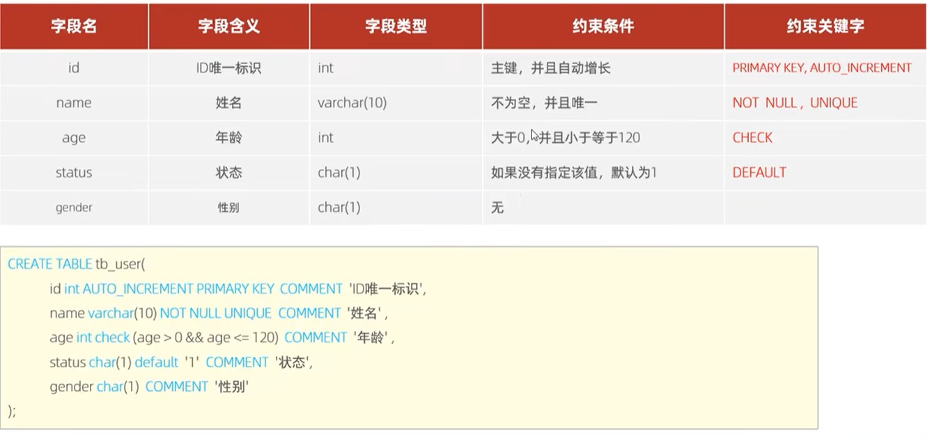 | 唯一约束 | 保证该字段的所有数据都是唯一、不重复的 | unique |